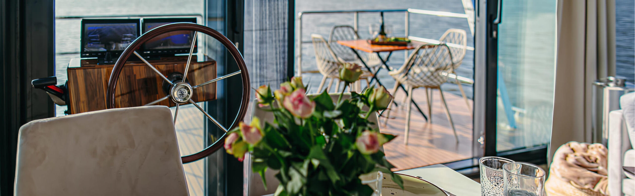 The front terrace changes the way you use your houseboat. It is an additional room without walls – a place for evening gatherings.